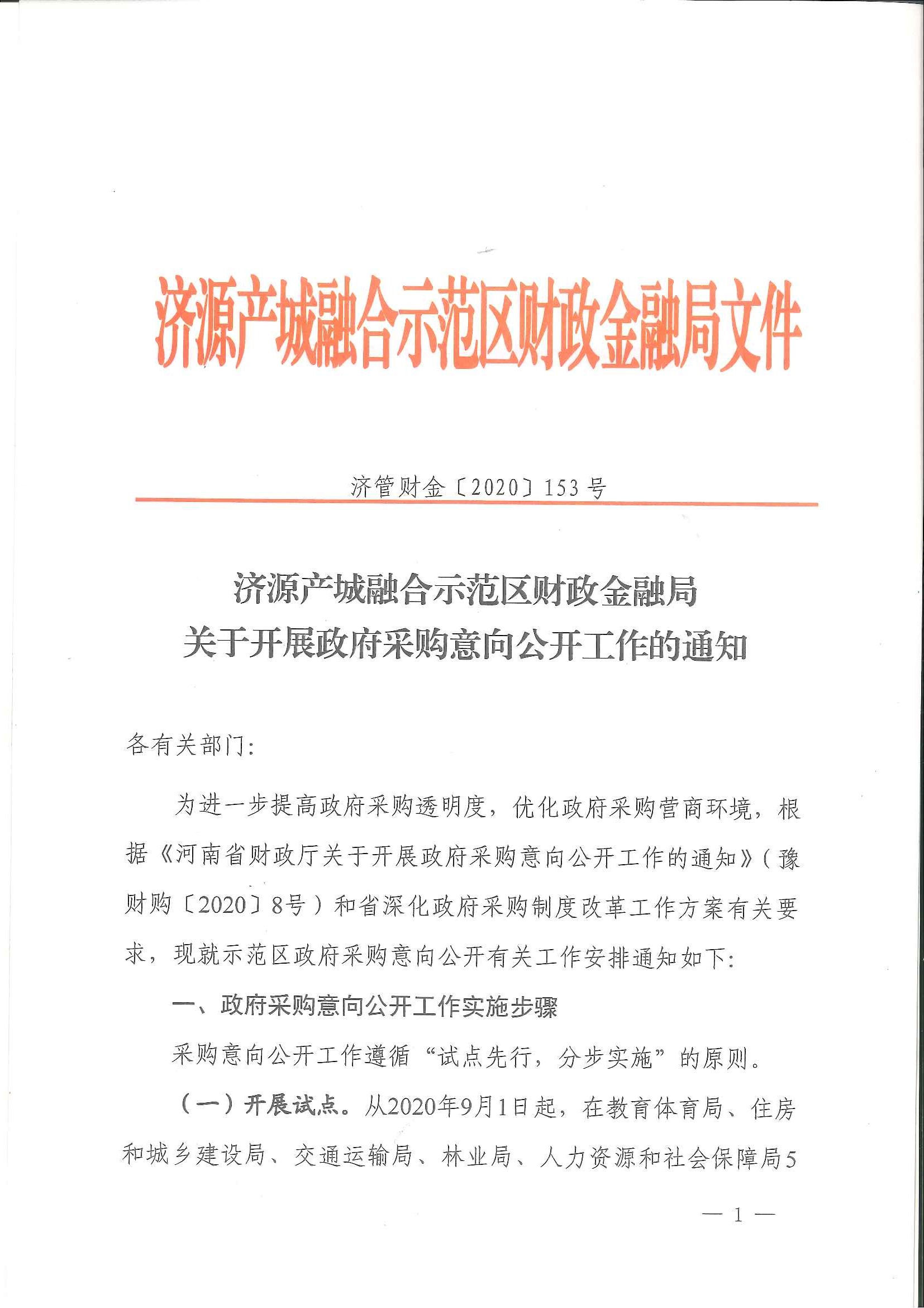 济源产城融合示范区财政金融局关于开展政府采购意向公开工作的通知(济管财金〔2020〕153号)