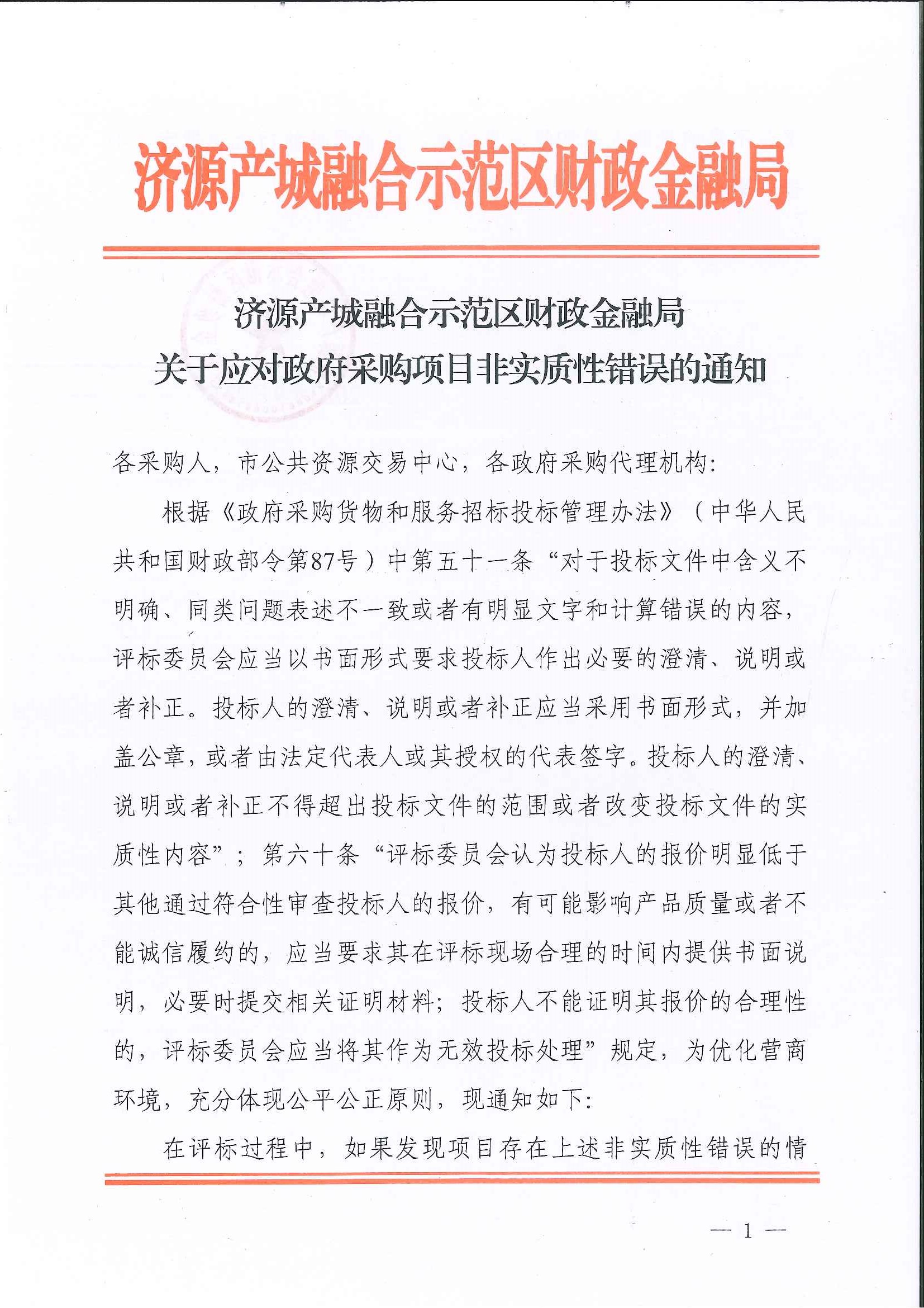 济源产城融合示范区财政金融局关于应对政府采购项目非实质性错误的通知
